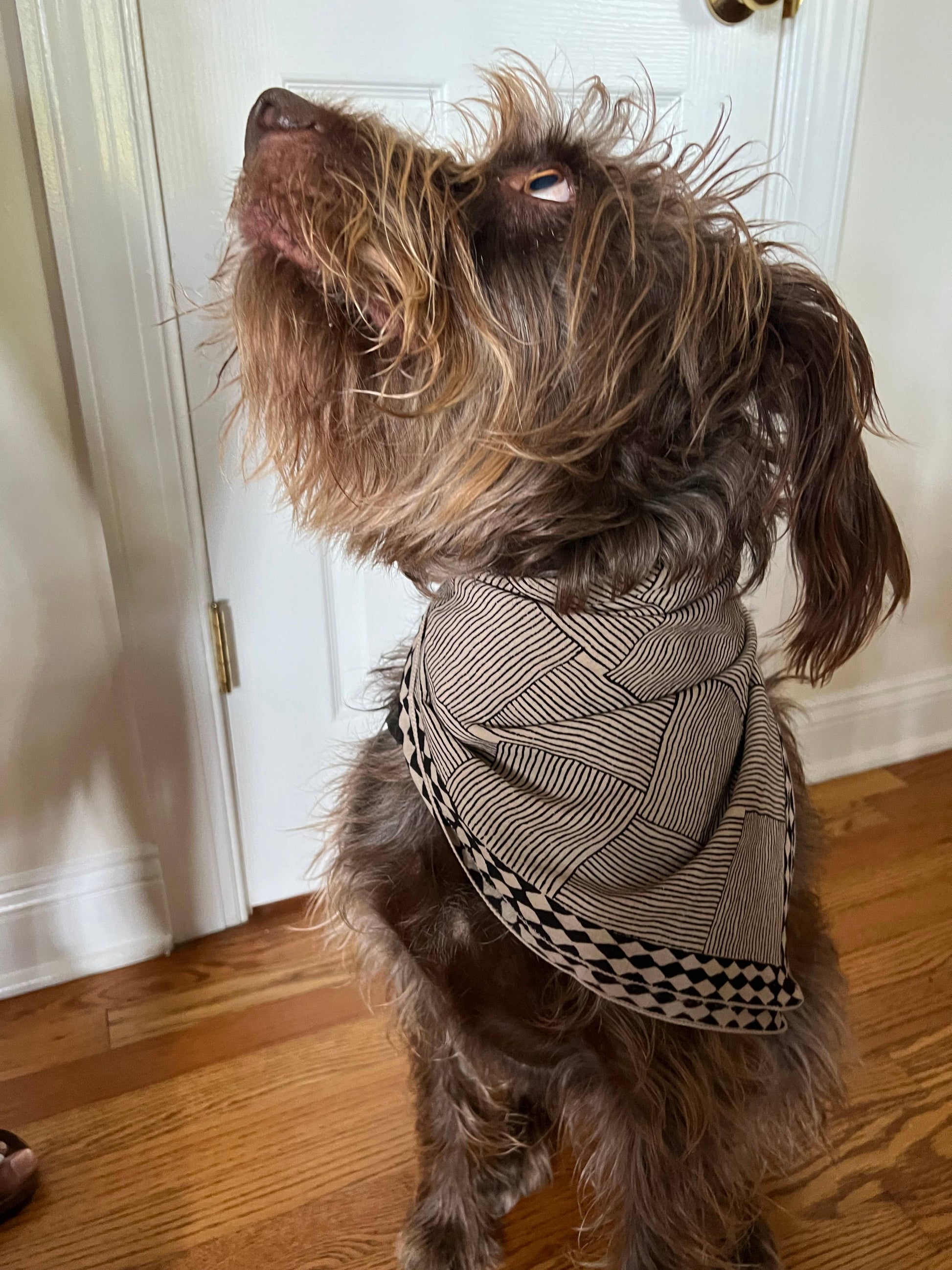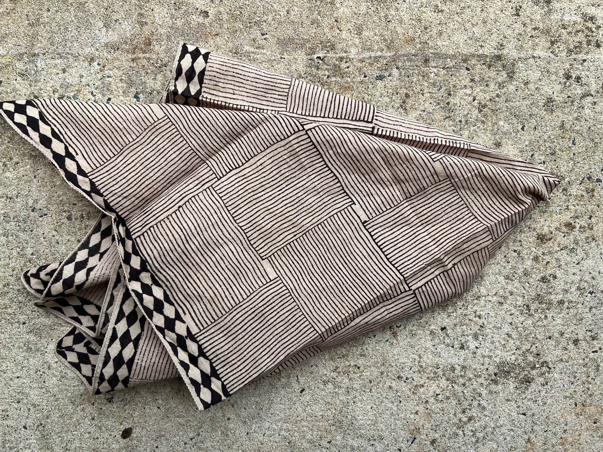 This chai colored bandana, with ink and pen doodled lines has been our most popular bandana in past seasons, especially fall and holiday. We have restocked in soft cotton. A wonderful accessory in the true sense, small and simple but elevates a coat, jacket or shirt in a quiet, fabulous way.