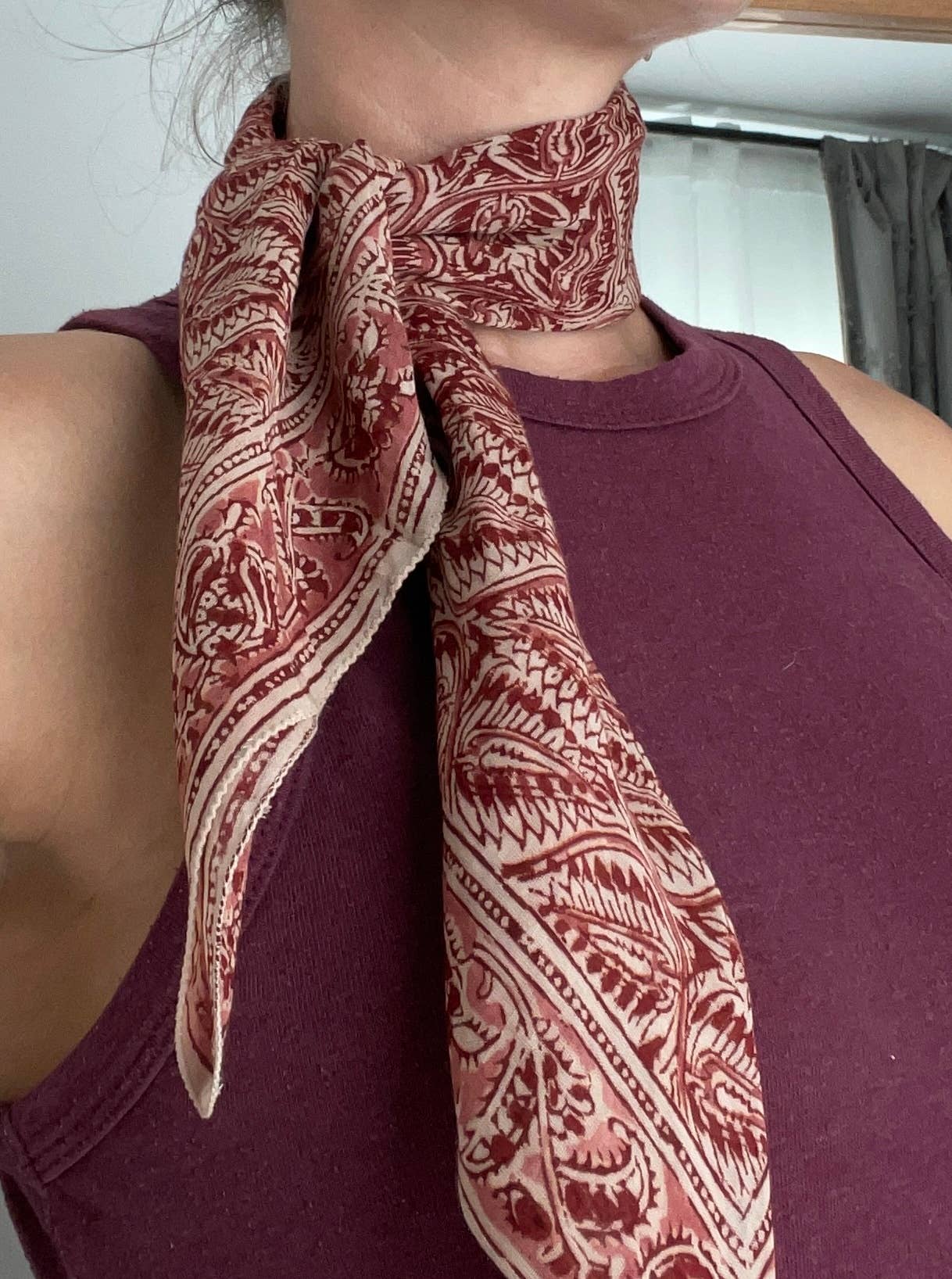 The Acanthus plant has been an inspiration to aritsts and designers for centuries. We have used the leaf form, block printed in a deep red for this bandana. This versatile bandana creates fashion and function with it's beautiful hand block printed design. This wine colored cotton bandana will add a pop of color to your display during the cooler temperatures of fall and winter. Beautiful and practical, check our other block print bandanas in our shop.