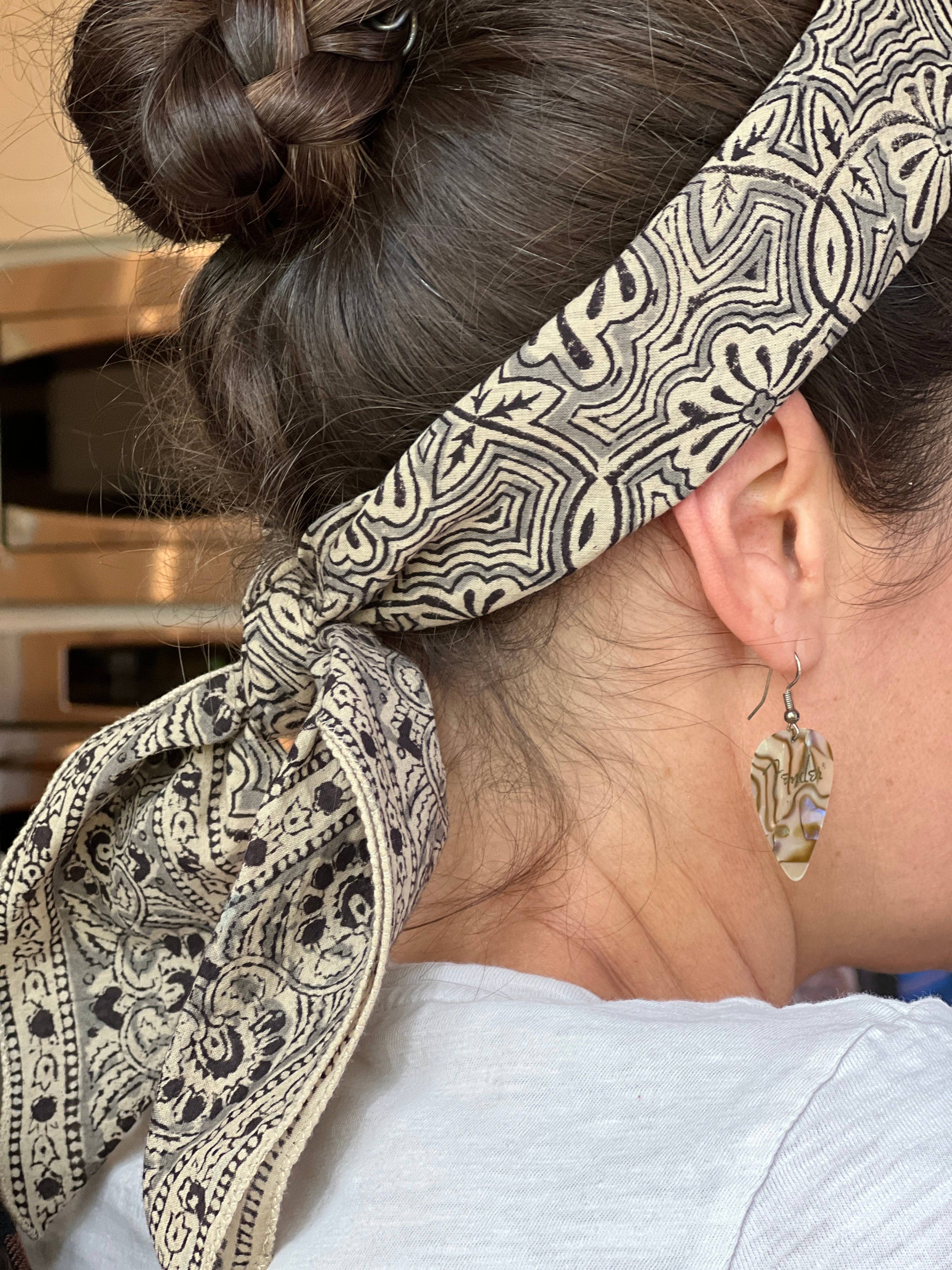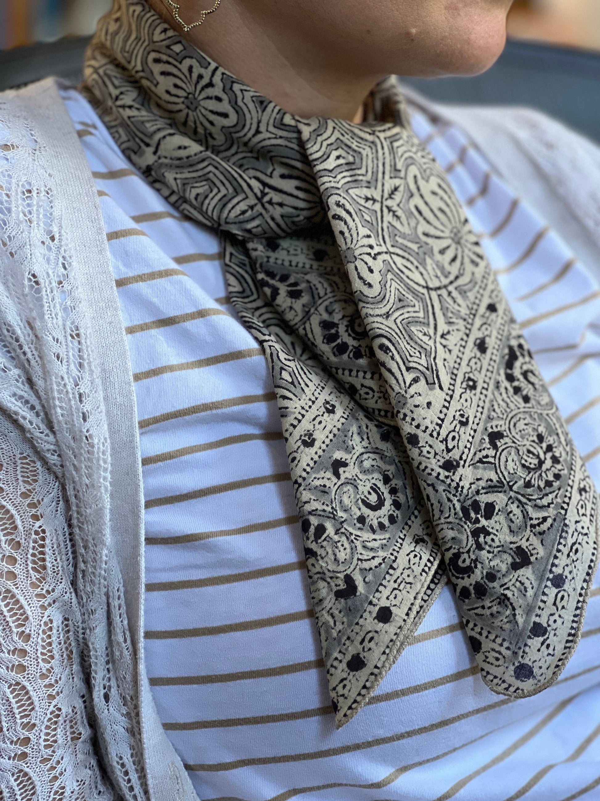 Hand block printed using wooden blocks on fine mulmul cotton, this bandana blends fashion and function. Wish Upon a Star print is a blend of neutrals that pairs well with any outfit. Add to your wardrobe as a hair accessory or to keep your neck cozy during cooler temperatures. Beautiful and practical, check our other Kalamkari block print bandanas in our shop.