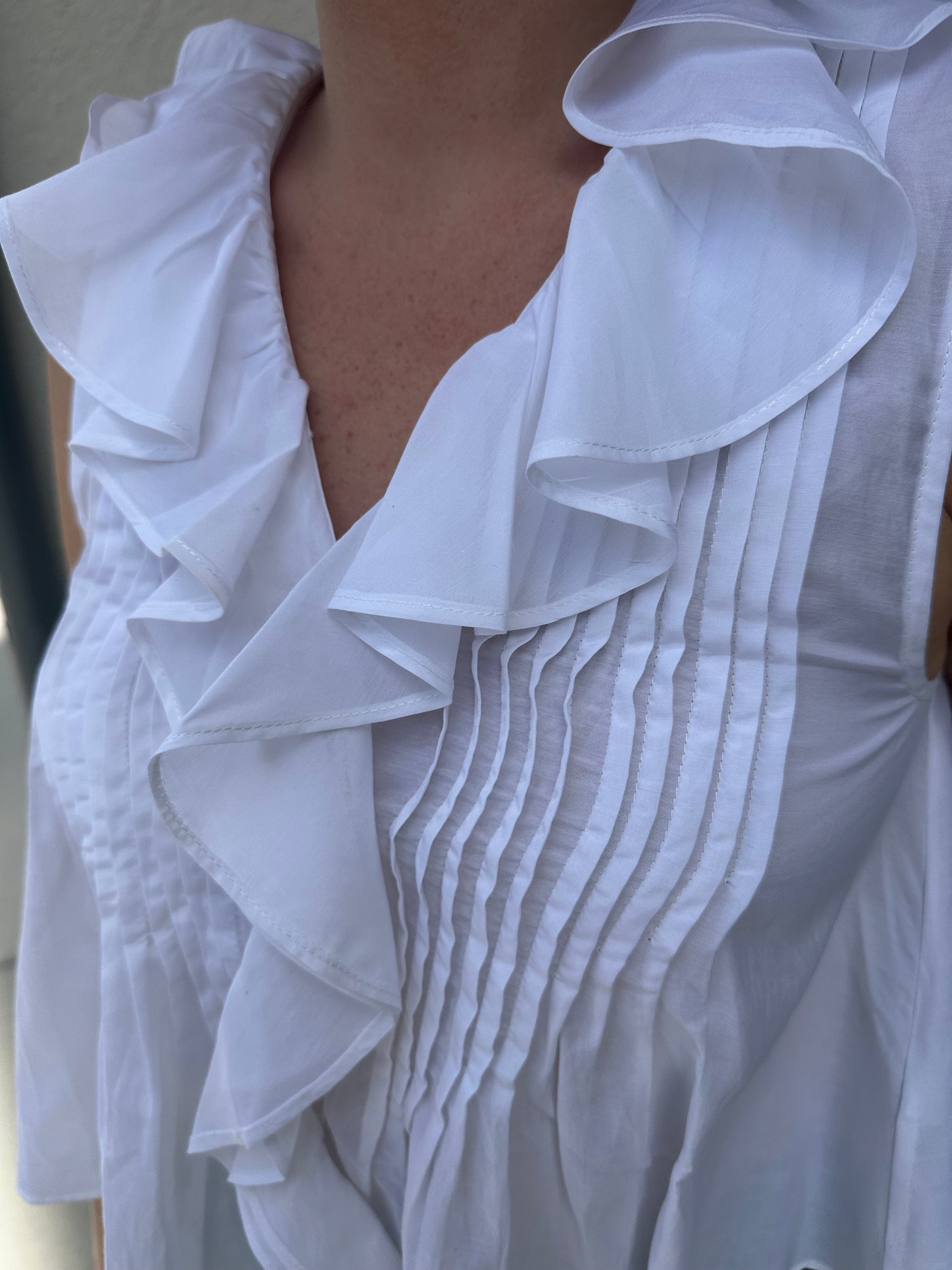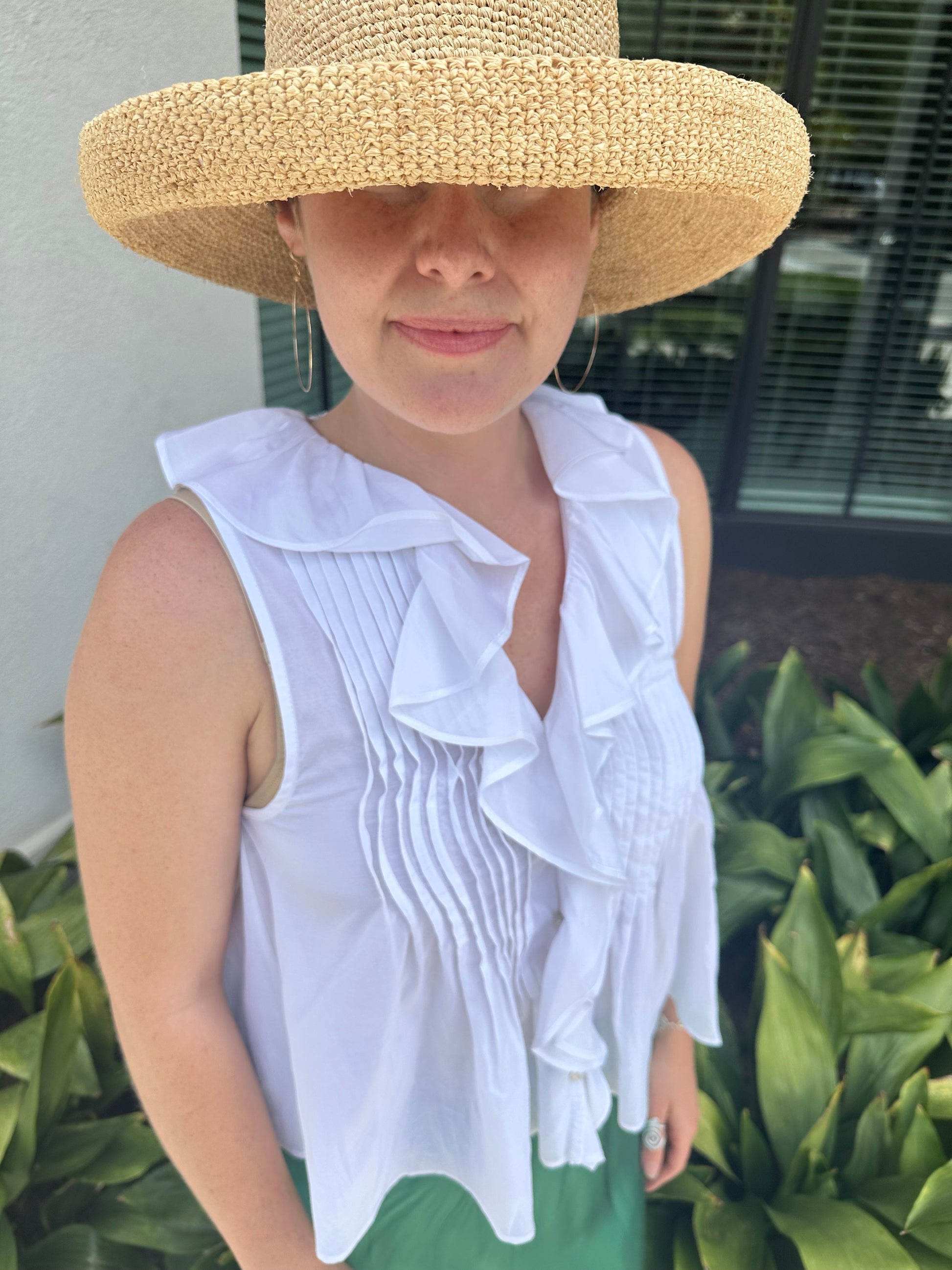Experience summer style with the Colina Tank Blouse. Made from a lightweight blend of viscose and cotton, this blouse features a ruffle detail and button front closure. Perfect for pairing with denim or a silk skirt, it's a versatile addition to your wardrobe.