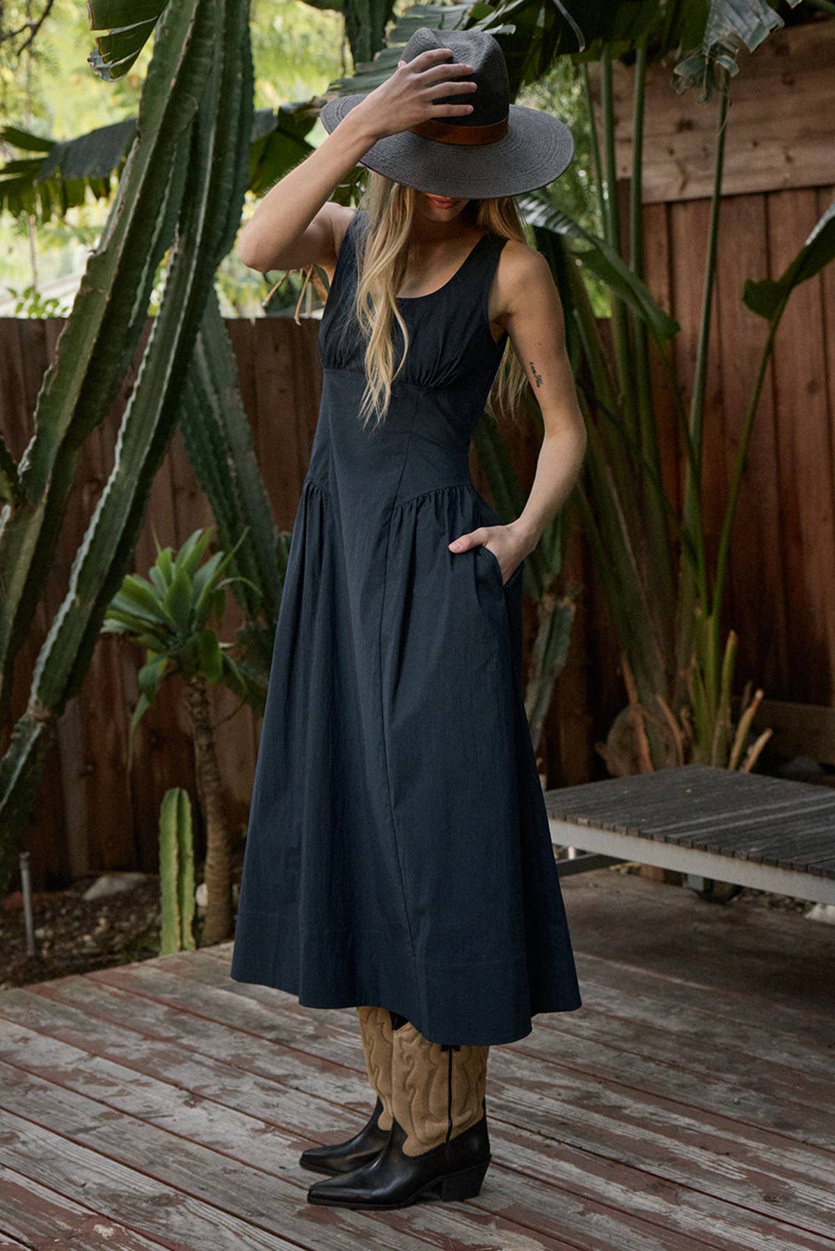 Crafted from a lightweight woven fabric, this dress is designed with wide shoulder straps, a clean scoop neckline, and subtle side gathering that adds movement and dimension.