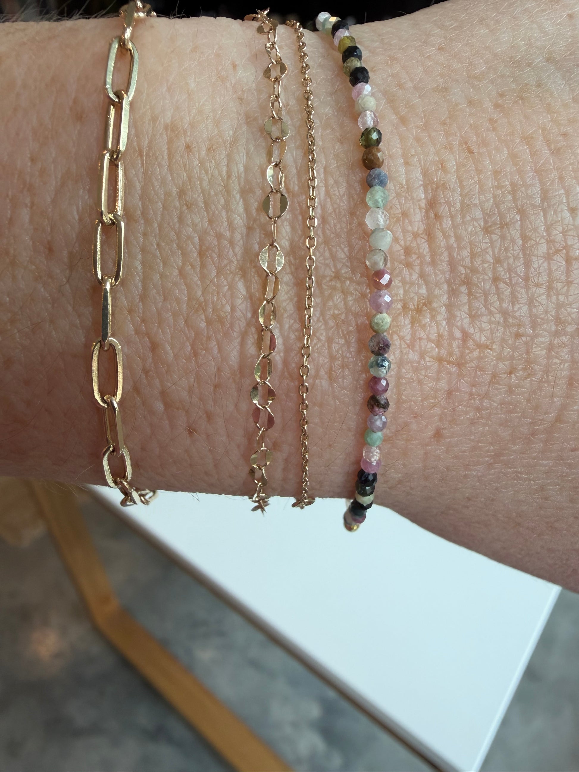Embodying the essence of coastal grace, the Mini Mixed Tourmaline Bracelet showcases delicate 2mm beads, effortlessly intertwining with the gentle allure of sunlight and sea. Adorned with a 14k gold filled clasp, its adjustable design ensures a perfect fit, making it an exquisite companion for layering or solitary elegance. Handmade in Wilmington, North Carolina, this bracelet encapsulates the timeless charm of everyday luxury.