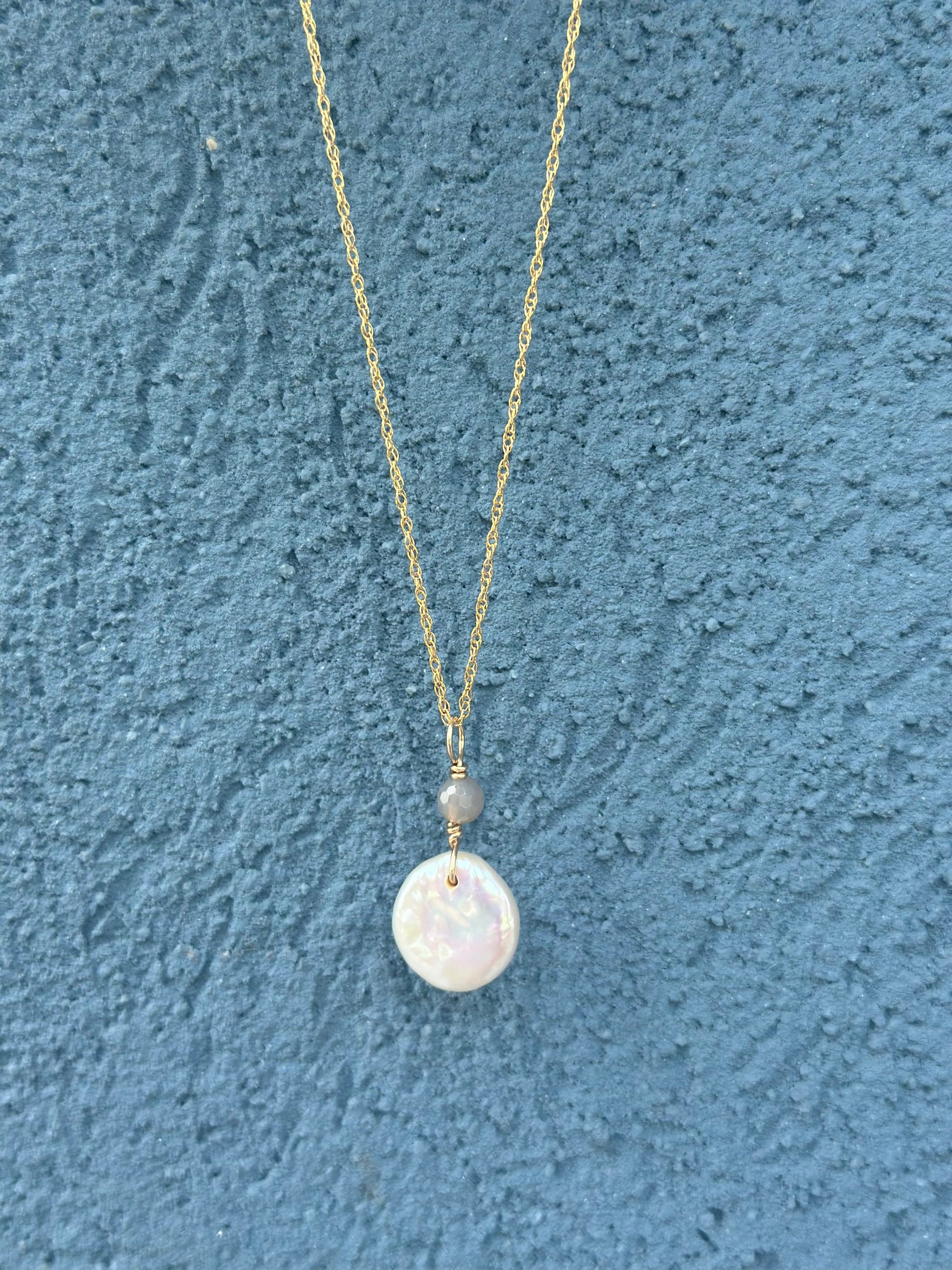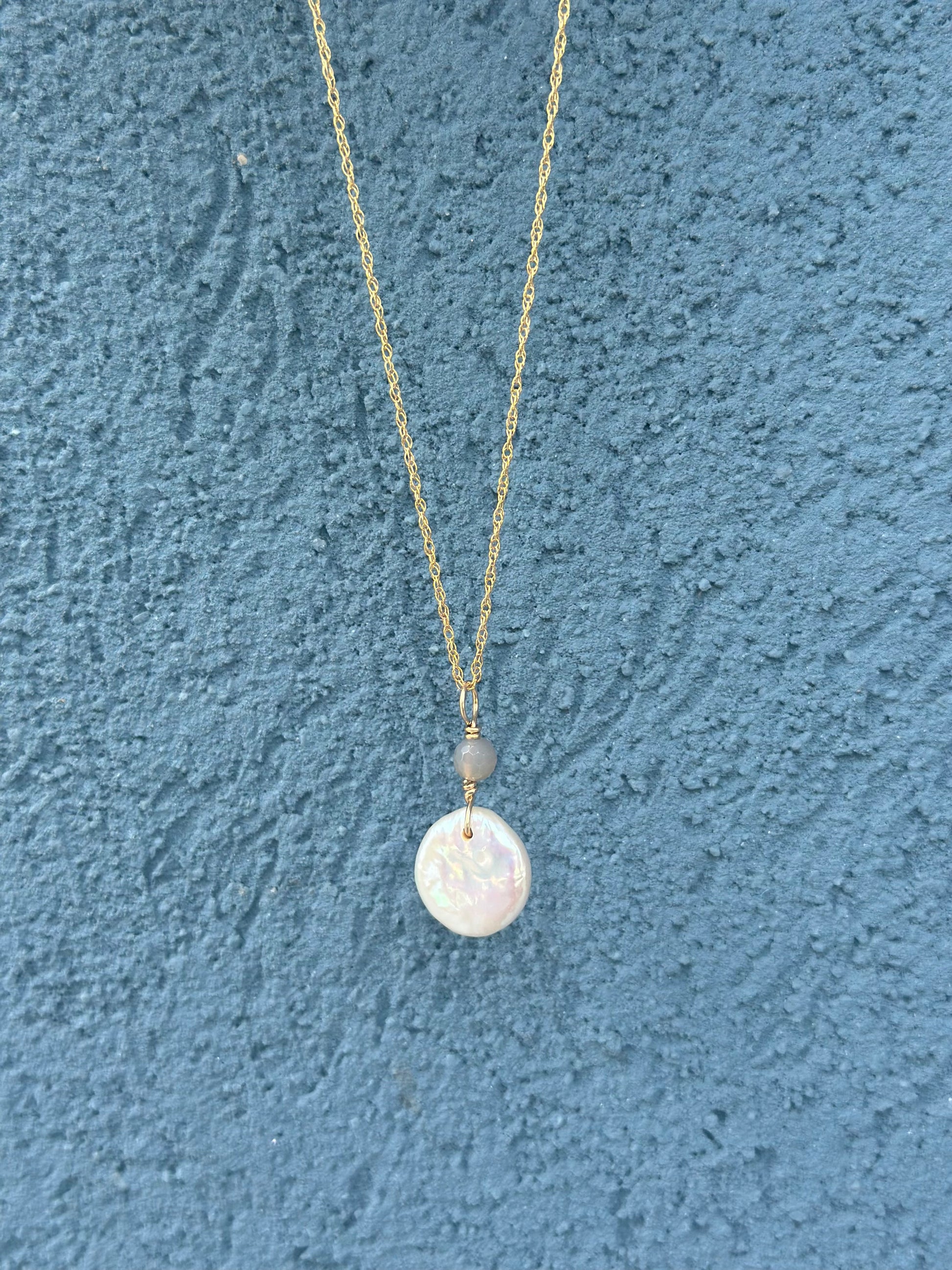 This elegant Pearl Coin Necklace boasts a lustrous Freshwater Pearl coin, delicately hung on a 18" gold filled chain. The perfect accessory for any occasion, this necklace marries classic style with timeless beauty. Elevate your look with this exquisite piece.