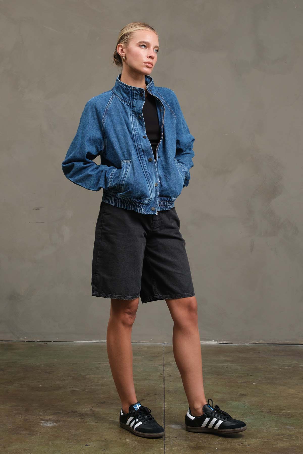 This washed denim bomber jacket features a relaxed fit with raglan sleeves, snap-button front closure, and gathered hem for a subtle cinched look.